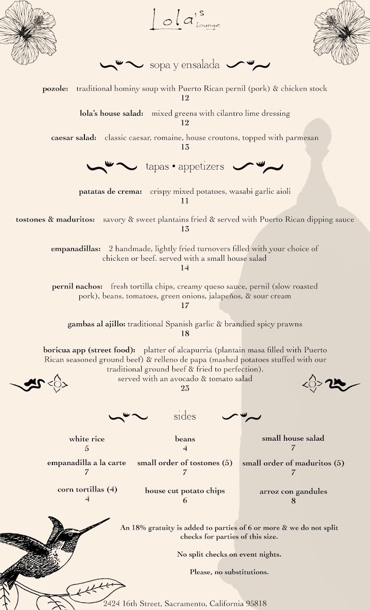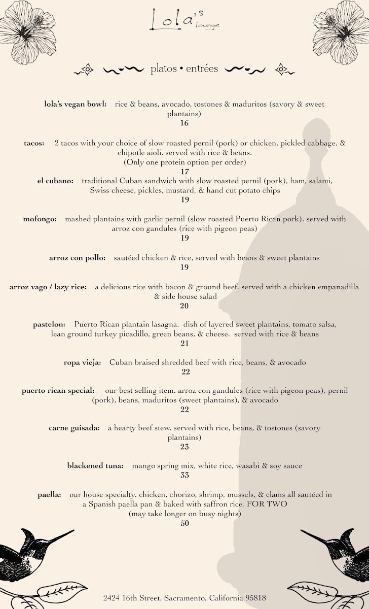 Welcome to Lola's Lounge, a culinary gem located at 2424 16th St, Sacramento, CA, where the heart of Puerto Rican and Caribbean flavors come alive. The menu is a delightful fusion of traditional and innovative dishes that showcases the vibrant culture. Begin with a comforting pozole or a refreshing Lola's house salad before diving into mouthwatering entrees like arroz con pollo or the layered pastelon. Each dish is crafted with care, embodying authentic flavors and warming aromas that transport you straight to the Caribbean.
